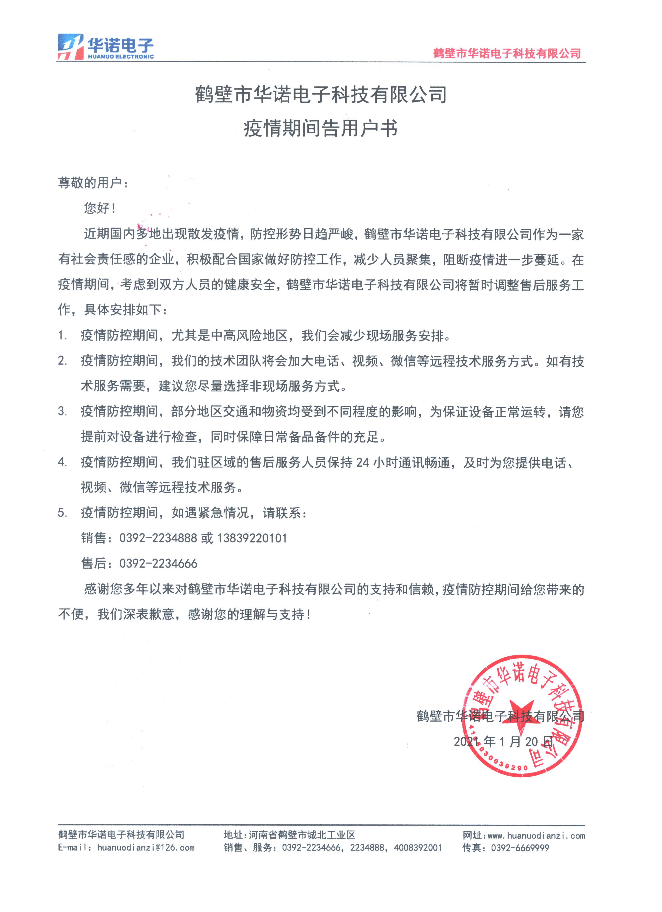 近期國內多地出現散發疫情,防控形勢日趨嚴峻,鶴壁市華諾電子科技有限公司作為一家有社會責任感的企業,積極配合國家做好防控工作,減少人員聚集,阻斷疫情進一步蔓延。在疫情期間,考慮到雙方人員的健康安全,鶴壁市華諾電子科技有限公司將暫時調整售后服務工作,具體安排如下: