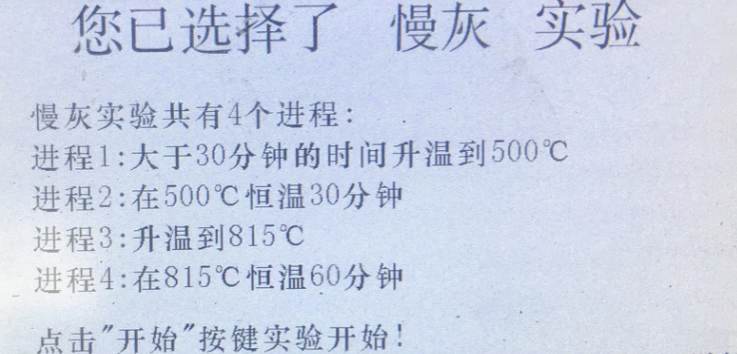 打開灰揮測定儀主界面選擇慢灰實驗,進入慢灰實驗界面。待爐溫小于100℃,打開爐門將裝有煤樣的灰皿(分析煤樣重量:1±0.1g)送入爐內(nèi)恒溫區(qū),打開煙筒,關(guān)閉爐門且安裝灰份座(使爐門保留15mm縫隙),點擊開始按鈕。進程顯示“1”,爐內(nèi)溫度開始慢慢上升。當溫度到達499℃后自動進入進程2,在500℃恒溫30min。時間到后自動進入進程3,爐溫繼續(xù)從500℃升到815℃。溫度達到后自動進入進程4,在815℃溫度下恒溫1h,時間滿足后,慢灰實驗結(jié)束,蜂鳴器智能提醒,點擊結(jié)束按鈕,結(jié)束本次實驗。打開爐門將試樣平穩(wěn)取出。